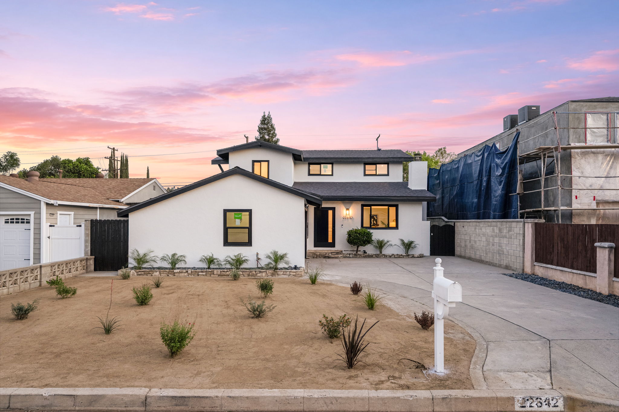 Stunning, fully reimagined designer residence in prime Woodland Hills. This 4-bedroom, 5-bathroom home spans nearly 2,500 square feet and has been completely renovated from top to bottom with permits, blending modern luxury with thoughtful functionality. Set behind brand-new landscaping and a striking entryway, the home welcomes you into a light-filled living room with soaring vaulted ceilings and a dramatic floor-to-ceiling stone fireplace that immediately sets the tone for the home. Every detail has been carefully curated, with high-end finishes and a seamless flow throughout. The spacious layout includes a formal dining room, inviting family room, separate living room and a beautifully designed chef's kitchen featuring Calacatta quartz countertops, custom cabinetry, and abundant storage. Sliding glass doors open to a private backyard retreat with a pergola, PebbleTec pool and spa, and lush, low-maintenance landscaping that is perfect for entertaining or embracing the indoor-outdoor California lifestyle. All four bedrooms are generously sized and offer ensuite bathrooms for ultimate comfort and privacy. Two ensuite bedrooms are conveniently located on the main level, ideal for guests or multi-generational living. Upstairs, the luxurious primary suite impresses with a grand double-door entry, an expansive walk-in closet, and a spa-inspired bathroom with double vanities and separate soaking tub, along with an additional ensuite bedroom and laundry area. No expense has been spared, with upgrades including porcelain tile, wide-plank laminate flooring, Calacatta quartz surfaces, new hardware, recessed lighting, new doors, and fresh interior and exterior paint. Major system improvements include a new HVAC system, black cool roof, new sewer line, new double-pane windows, and updated plumbing and electrical, along with a newly finished two car garage. The newly landscaped front yard showcases a clean, modern desert-inspired design, completing this turnkey Woodland Hills home that truly has it all.